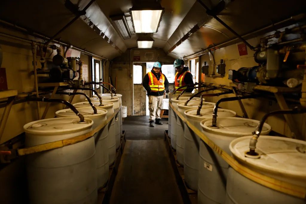 Transit officials on Friday showcased a de-icer car stocked with 11 barrels containing 605 gallons of fluid at a Brooklyn subway yard ahead of a snowstorm that has the MTA in an all-hands-on-deck mode. The car — rusted in spots, but still fully functional after decades on the tracks — is equipped with specially made devices that scrape ice off the third rail, then spray it with fluid.