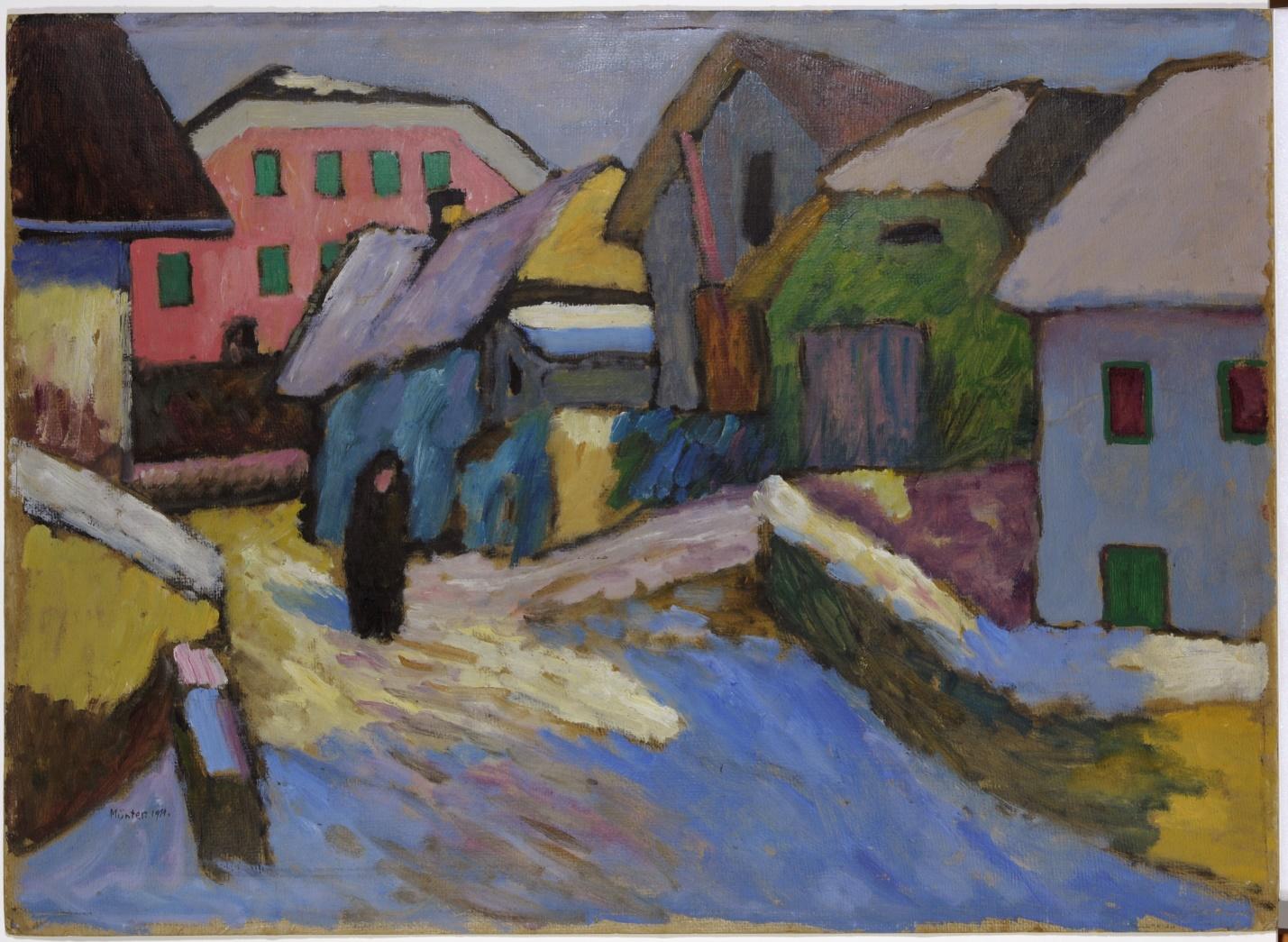 In Munich, Münter met Kandinsky while in his life-drawing class and later trained with him as a painter. They became a couple, despite his marriage to his cousin, which did not end until 1911. Two years after meeting, they began traveling extensively and painting side by side. During this period, Münter shifted from brushes to a palette knife. Both had independent means and traveled to Tunisia, Italy and Paris, where they rented an apartment. There, Münter developed her printmaking practice, with six oil studies included in a major exhibition. After returning to Germany, she worked intensively on linocuts and woodcuts, while continuing to live and travel with Kandinsky.