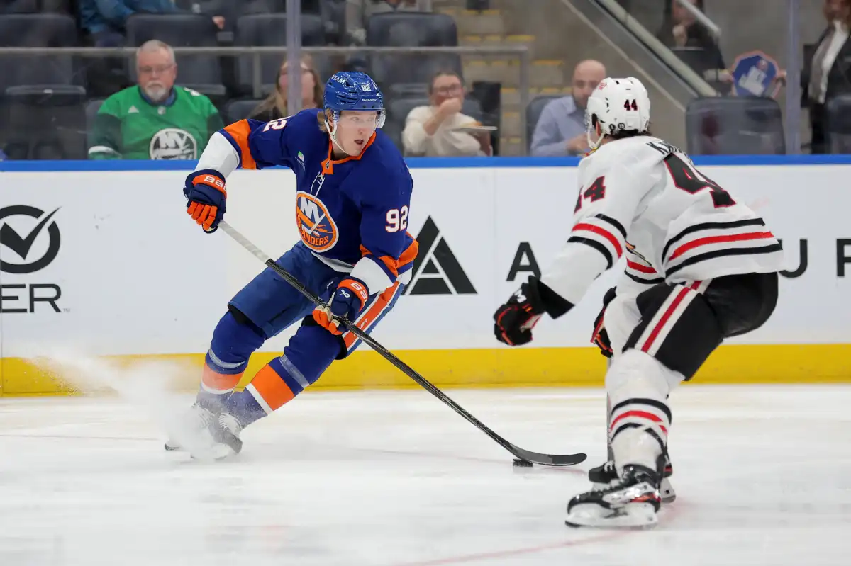 Mar 24, 2026; Elmont, New York, USA; New York Islanders right wing Simon Holmstrom (92) skates with the puck against Chicago Blackhawks defenseman Wyatt Kaiser (44) during the first period at UBS Arena. Mandatory Credit: Brad Penner-Imagn Images