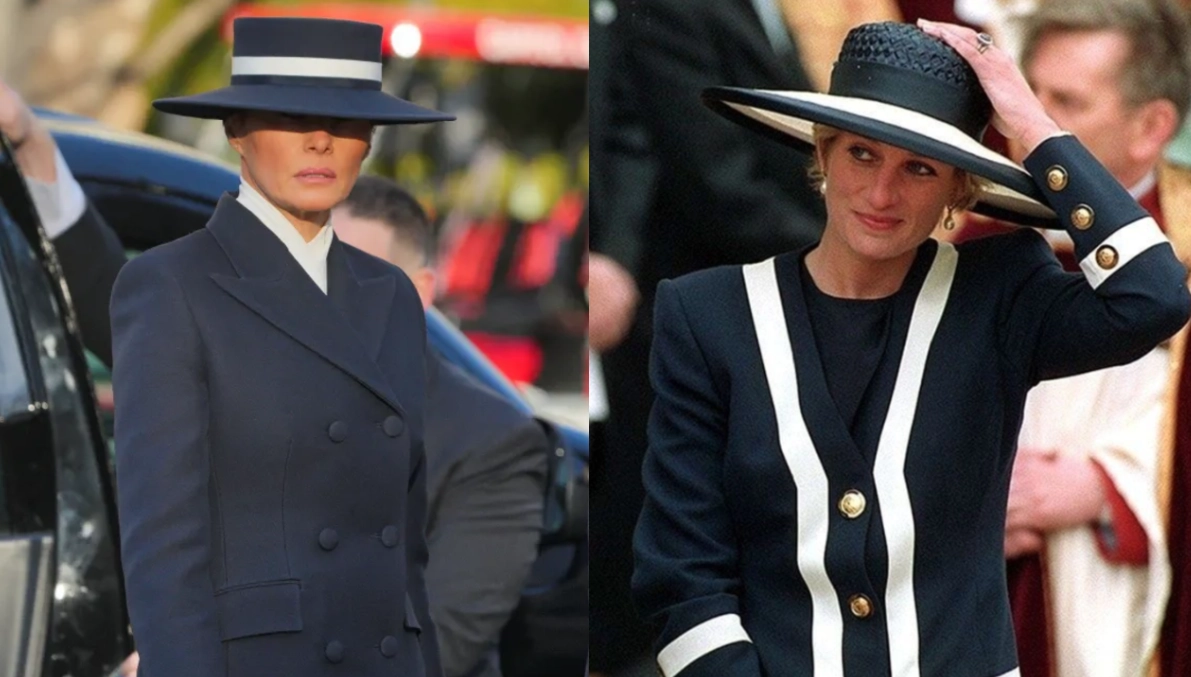 Melania wears very similar clothes to Diana. She chooses classic tailored suits in bold colors. She wears navy outfits with wide-brimmed hats that match Diana’s 1993 blue-and-white Catherine Walker suit and hat. She appears in white and navy combinations with custom hats exactly like Diana’s 1995 look.